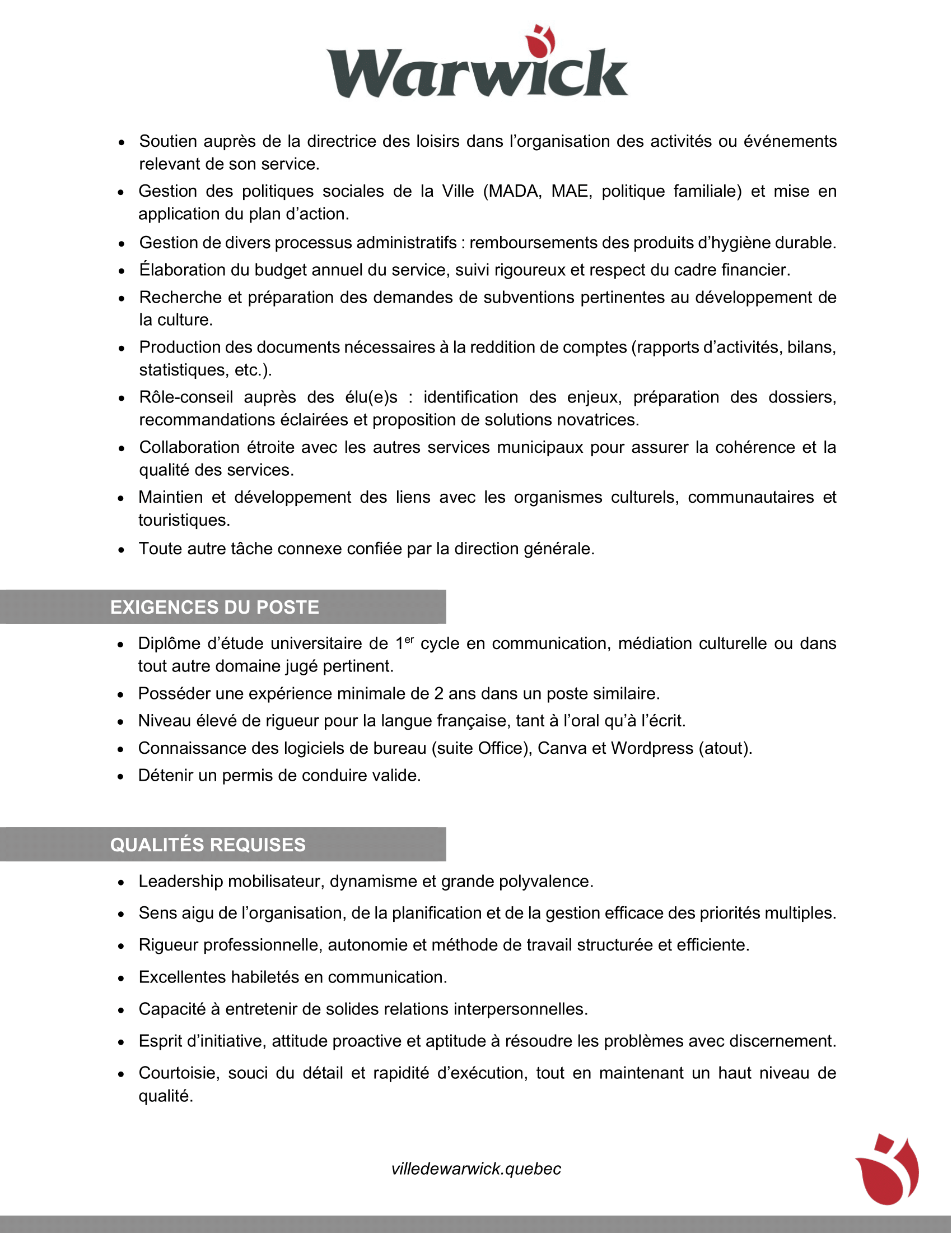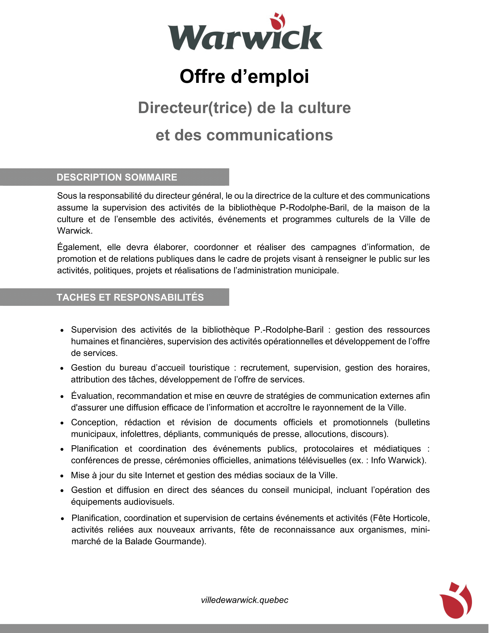 Offre d’emploi – Directeur(trice) de la culture et des communications