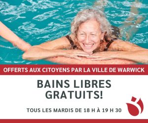 La Ville de Warwick offre gratuitement à ses résidents des moments de baignade libre les mardis de 18 h à 19 h 30.