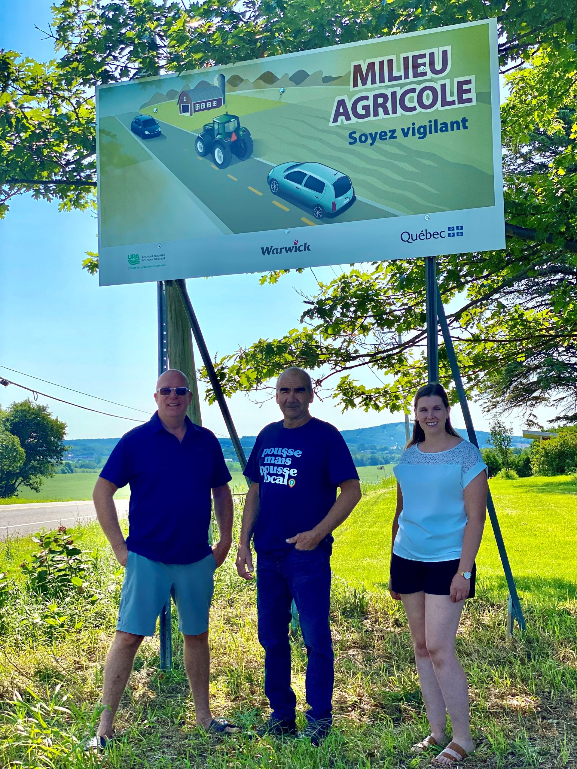 La conseillère municipale, madame Céline Dumas, rappelle que les panneaux ont été déployés sur le réseau routier pour conscientiser les conducteurs à l’importance de respecter les règles de circulation et d’adopter des comportements sécuritaires et respectueux. « L’enjeu est prédominant considérant que le territoire de Warwick est occupé à plus de 95 % par le zonage agricole ! », a-t-elle ajouté.